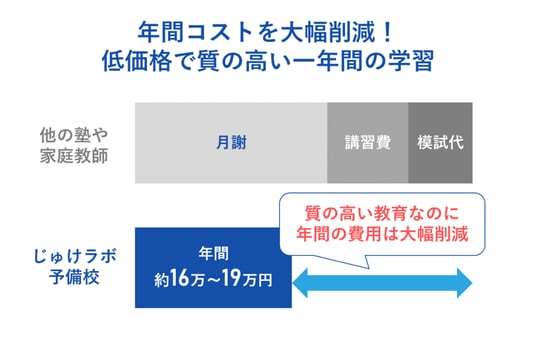 年間の塾や家庭教師費用というのは、単なる月謝の12倍というわけではありません。季節ごとの講習や教材費、模試費用など、多くの費用が発生します。これに対して、じゅけラボ予備校は月額を通年で計算しただけのシンプルでリーズナブルな料金設定なので、年間費用は約16万8,960円~19万5,360円(最難関コースは特別料金が別途発生)です。教育の質を維持しつつ、年間の費用を大幅に削減したい保護者には、最適な選択肢となり得ます。
