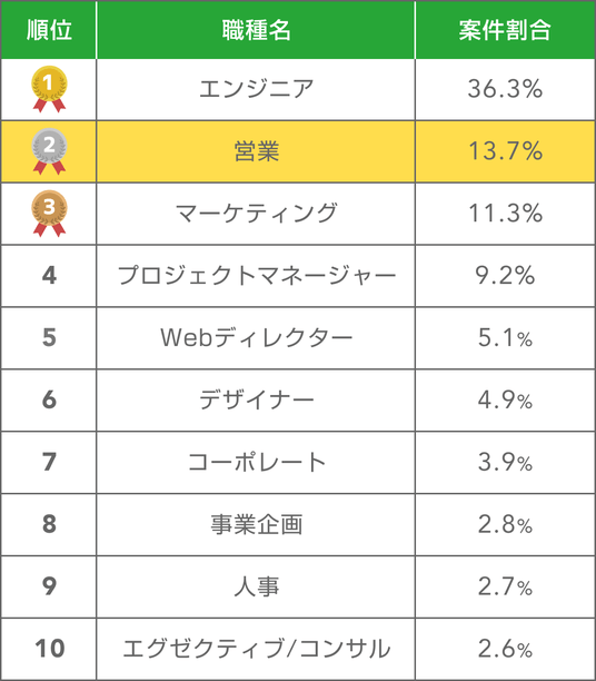 営業・セールス案件は案件比率13.7%で職種別2位と、エンジニア(36.5%)に次ぐ豊富な需要があります。年収ランキングでは10位と控えめな一方で、案件数では上位に位置するのは、幅広いスキルレベルや業界で営業人材が求められているためです。SaaSからコンサルティングまで多様な業界で必要とされ、企業の成長段階や事業規模を問わず常に需要がある職種特性が反映されています。この豊富な案件数は、営業職の汎用性の高さと市場での安定した需要を示しており、転職やキャリアチェンジを検討する際の選択肢の多さにもつながっているといえるでしょう。