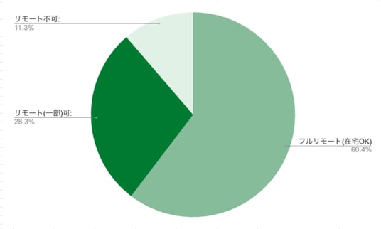 営業・セールス案件は、フルリモートが60.4%、一部リモート可が28.3%で、合計88.7%がリモートワークに対応しています。顧客との信頼関係構築が重要な営業職でも、これだけ高いリモート対応率を実現しているのは、成果重視の評価体系により場所よりも結果が重視される職種特性があるためです。リモート不可の11.3%は、製品デモンストレーションや重要商談など、対面での価値提供が不可欠なケースに限られています。エンジニア職種と比べるとやや低めですが、営業成果を出せれば働く場所の自由度は十分に確保されている職種といえるでしょう。