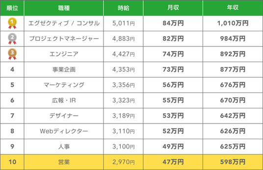 平均年収598万円(職種別年収ランキングトップ10中、10位)