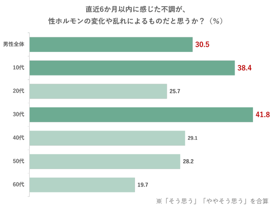 対して、男性は全体の約7割が直近6ヶ月以内に不調や変化を経験しているにもかかわらず、それを性ホルモン変化と関連づけられた人は3割台にとどまる結果に。今年度の「骨太の方針」に初めて記載された「男性更年期」。男性更年期は40代以降で症状を感じる人が多い傾向にあり、どの年代にも症状が起こり得るという点では女性の更年期と異なりますが、自身の体の不調の原因に「性ホルモンの変化や乱れ」が関係している割合は、全年代において、相対的に女性より低い結果になっています。