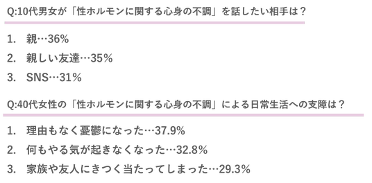 ですが、母親世代である40代女性の「性ホルモンの変化による心身の不調がどのように日常生活に支障をきたしているか?」という質問に対する回答には「理由もなく憂鬱になった」「何もやる気が起きなくなった」などの気分の落ち込みに次いで「家族や友人にきつく当たってしまう」が多い結果に。思春期特有の不調を親と共有したい子どもと、家族にきつく当たってしまうことに悩んでいる母親による家庭内の摩擦が懸念されます。
