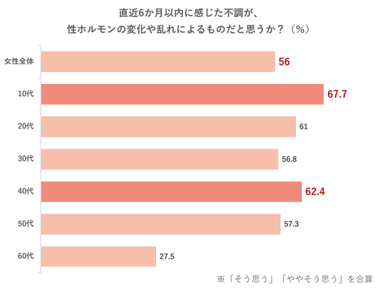 1. 【女性のホルモンバランス】女性の半数以上が「性ホルモンの変化や乱れ」による不調を経験。思春期や更年期が起こりやすい10代と40代が顕著。職場や学校のサポートを求める声も5割超