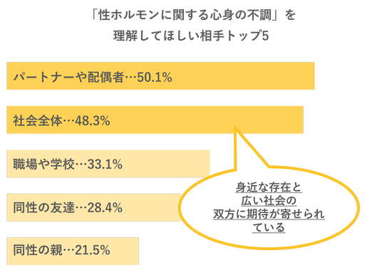 性ホルモン不調について「自分の不調を理解してほしい相手」としては社会全体とパートナーがそれぞれ約5割と高く、最も身近な関係性と広い社会の双方に期待が寄せられていることが明らかになりました。