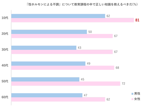 「『性ホルモンとは何か』『性ホルモンバランスが乱れると何が起こるか』等『性ホルモン』に関して、どのような場で知識を得たか」という質問に関しては、「機会がなかった」が48.3%と最も高かったものの、次いで、「テレビやWeb記事などを読んで知った」が30.4%となりました。また、「興味を持ったきっかけ」は、「たまたまテレビやWeb記事などで目にして興味を持った」が、46.2%と最も高く、様々なメディアとともに積極的に情報発信を行う必要性を再認識する結果に。「学ぶ機会を増やすべき」は54.3%、特に10代では66%と高い数値となり、「教育課程の中で正しい知識を教えるべきだ」についても、年代別で最も高い71.5%、特に10代女性は81%と高い結果となりました。性ホルモンについて、教育課程での導入ニーズが強く表れています。
