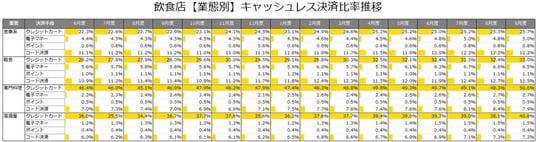 - 集計3:飲食店 ジャンル別 キャッシュレス決済方法比率、キャッシュレス決済比率