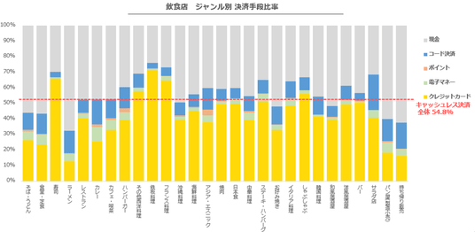 - ジャンル別に見ると、28ジャンル中22ジャンルでキャッシュレス比率が50%を超える。