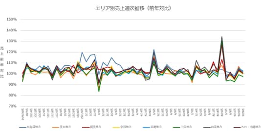 - 9月売上における、前年対比の伸長率(地方平均)は100.0%と前月から6.9pt減少した。各地域の売上伸長率は、近畿地方が最も高く前年対比101.7%となった。