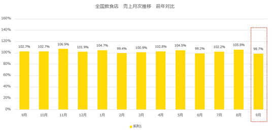 - 9月度の前年対比の売り上げ伸長率は、前月から7.1pt減少した。売り上げは前年対比98.7%と三か月ぶりにマイナスとなった。