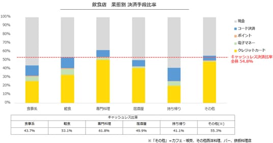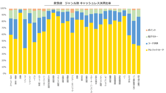 - ジャンル別に見ると、28ジャンル中22ジャンルでキャッシュレス比率が50%を超える。また、コード決済比率が高いサラダ店では、その比率が22.7%を占める。