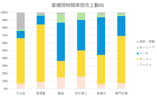 - 業種別時間帯別売上動向を見ると、9月度でディナータイムの売上割合が一番多いのは居酒屋、次に専門料理となりその差は13.ptとなった。一方ランチタイムの売上割合が一番高いのは、軽食、次に食事系となり、その差は0.8ptとなった。