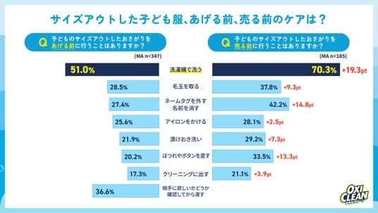 特に「洗濯機で洗う」はあげる前の51.0%に対し、売る前は70.3%と約2割増加。また、「漬けおき洗い」「毛玉を取る」「ネームタグを外す」「ほつれを直す」などの丁寧なケアも、いずれも“売る時”の方が上回る結果となりました。
