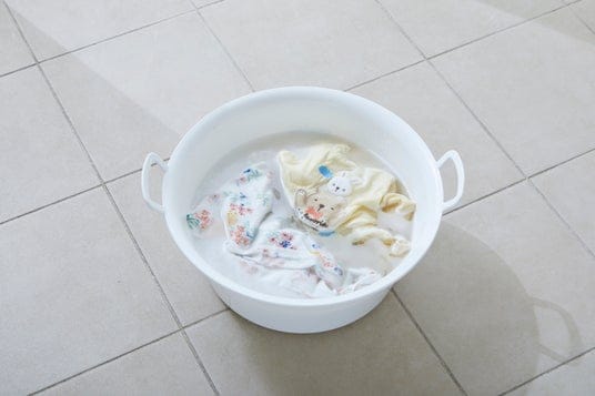 洗い桶にお湯を入れ、酸素系漂白剤を溶かして混ぜます。溶かした液に汚れた物を漬けたら、20分程度を目安に漬け置きしてください。酸素系漂白剤は、6時間程度、漂白効果が続くと言われていますので、汚れとニオイの程度に合わせて調節してください。漬けおきが終わったら、通常どおり洗濯します。