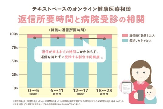 分析の結果、返信時間は0~5時間台が最も多く(約4割)、約7割の相談で12時間未満に返信されていました。そして、返信時間が0~5時間台であっても18~23時間台であっても、返信前に病院を受診する人の割合に有意な差は認められませんでした。また、全体での満足度(再利用意向)は99.5%で、返信前に病院を受診したことが満足度に影響を与えていないことも分かりました。