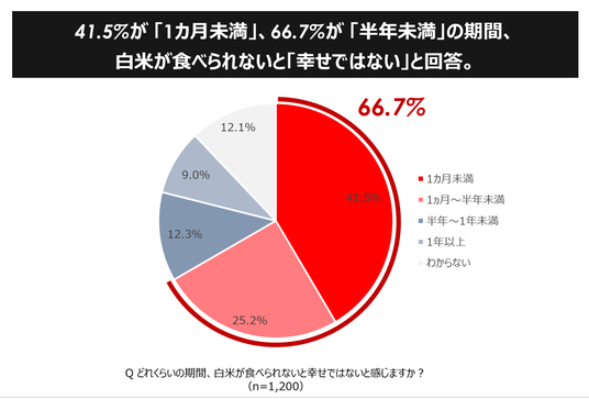 41.5%が「1カ月未満」、66.7%が「半年未満」の期間、白米が食べられないと「幸せではない」と回答。