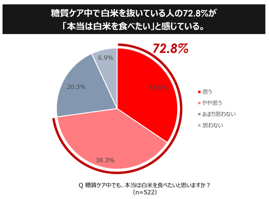 糖質ケア中で白米を抜いている人の72.8%が「本当は白米を食べたい」と感じている。