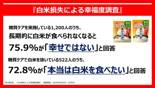 味の素株式会社(社長:中村 茂雄 本社:東京都中央区)は、2024年3月21日(木)に販売開始した、おいしさはそのままに、酵素の力で糖の吸収が穏やかなご飯が炊ける革新的な炊飯器専用調理料「白米どうぞ(R)」の販売数が前年に比べて2倍以上に伸長し需要が拡大していることを受け、改めて糖質ケアを行っている方にとっての「白米を食べること」の価値への理解を深めることを目的に、糖質ケア当事者1,200名を対象に『白米損失による幸福度調査』を実施しましたので、その結果をお知らせいたします。
