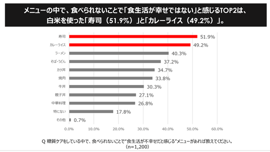 メニューの中で、食べられないことで「食生活が幸せではない」と感じるTOP2は、白米を使った「寿司(51.9%)」と「カレーライス(49.2%)」。