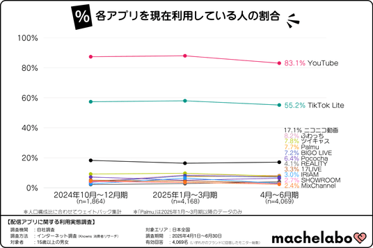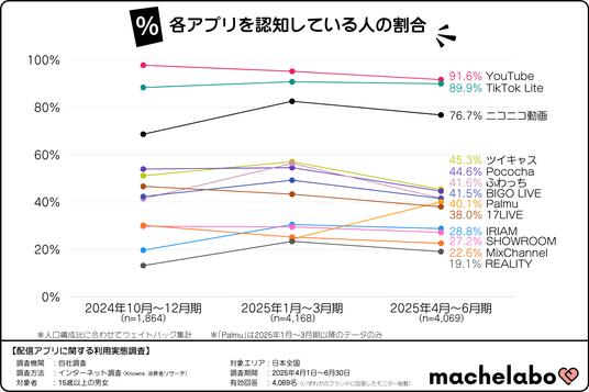 ※本調査は、各回答者にランダムに1つのブランドを提示し、そのブランドについて質問を行っており、上記の有効回答数は調査期間中にいずれかのブランドについて回答したモニターの総数を示します。各ブランドの有効回答数は、Palmu:1922名、TikTok Lite:1450名、SHOWROOM:940名、17LIVE:938名、MixChannel:886名、YouTube:883名、Pococha:838名、ニコニコ動画:822名、IRIAM:663名、REALITY:662名、ふわっち:589名、ツイキャス:580名、BIGO LIVE:571名です。なお、本リリースで記載している各割合(%)は、人口構成比に合わせてウェイトバック集計を行ったものです。