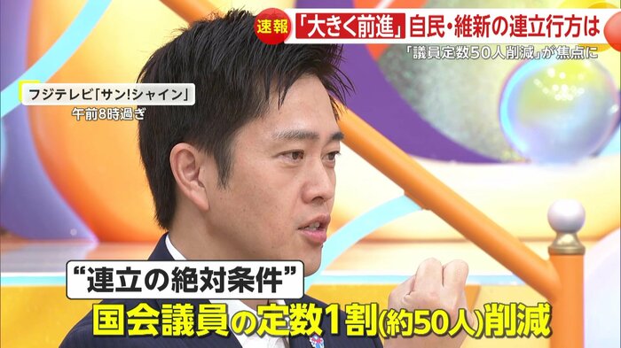 維新の吉村代表がフジテレビの番組で“連立の絶対条件”として、国会議員の定数1割(約50人)を削減することを挙げたのだ。