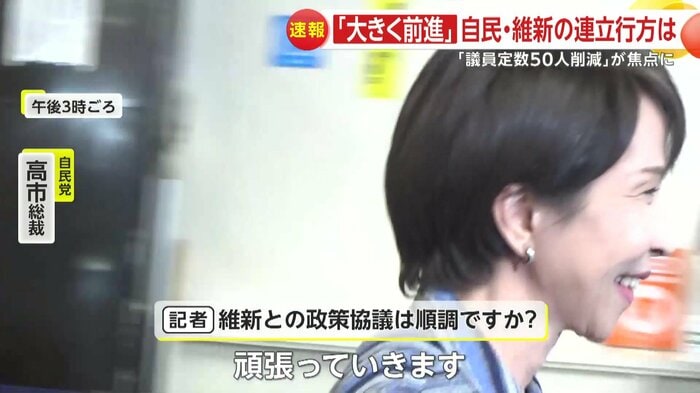 午後3時、日本維新の会との2回目となる政策協議のため自民党本部をあとにする高市総裁は、記者からの「維新との政策協議は順調ですか?」との問いに「頑張っていきます」と話した。