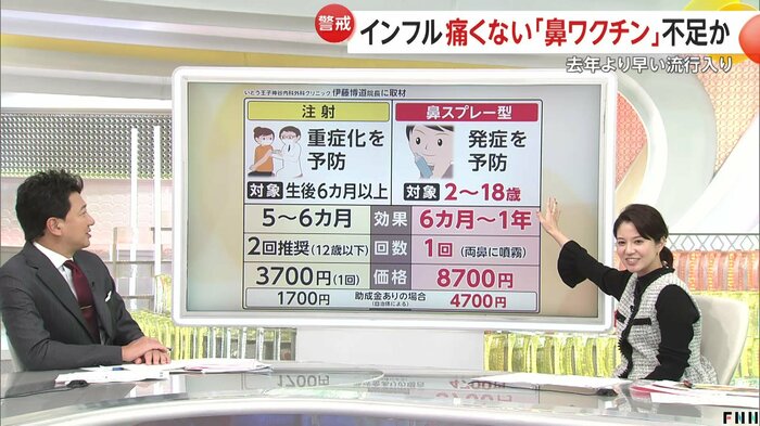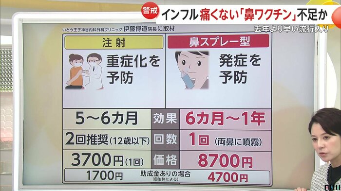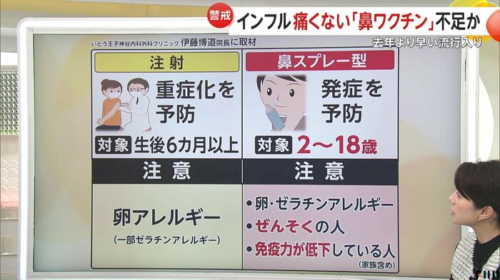 伊藤院長によると、根本的に注射は「重症化を予防する」、鼻スプレーは「発症を予防する」というメリットがあるが、鼻スプレー型は生ワクチンのため、注意が必要な場合があるという。