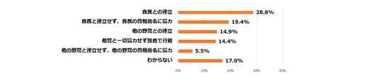 次期政権の枠組みや国会での首相指名をめぐり、自民党と日本維新の会は連立政権を視野に政策協議を開始した。維新は今後、どのような対応を取るのがふさわしいと思うか聞くと、「自民との連立」28.8%、「自民と連立せず、自民の首相指名に協力」19.4%、「他の野党との連立」14.9%、「他党と一切協力せず独自で行動」14.4%、「他の野党と連立せず、他の野党の首相指名に協力」5.5%となった。「わからない」は17.0%。