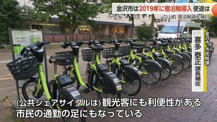金沢市の宿泊税は、1人1泊、5000円以上2万円未満の宿泊料金で200円、2万円以上だと500円となっている。年間の税収はおよそ10億円に達し、中心部の観光案内所の運営や、市民も利用できるシェアサイクルの整備などに活用されている。