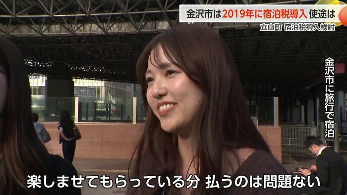 金沢市に旅行で訪れた観光客からは「楽しませてもらっている分、払うのは問題ない」という声があった。また出張で宿泊した人からも「(宿泊税を)役立ててもらって金沢が潤うのであれば必要」との意見が聞かれた。
