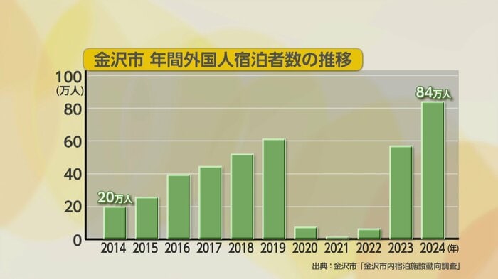 金沢市民税課の喜多泰正課長補佐によると「宿泊者数と観光の入込客数は増加傾向」にあり、「外国人観光客のほうが増加傾向にある」という。金沢市の宿泊客数は年々増加し、去年はおよそ420万人。そのうち外国人は84万人で、10年前の4倍以上となっている。