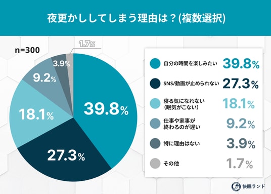 - 夜更かし理由1位:「自分の時間を楽しみたい」(39.8%)