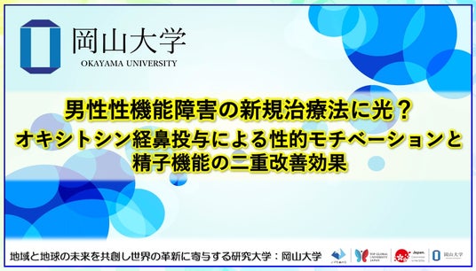 国立大学法人岡山大学(本部:岡山市北区、学長:那須保友)の大学院環境生命自然科学研究科博士前期課程の榎本千夏大学院生(研究当時、理学部生物学科4年)、同学術研究院環境生命自然科学学域(理)の越智拓海准教授、坂本浩隆教授(神経内分泌学)は、広島大学大学院統合生命科学研究科の島田昌之教授との共同研究により、「オキシトシン」の経鼻投与が雄ラットの性的モチベーションと精子機能を同時に改善する革新的な二重作用メカニズムを世界で初めて明らかにしました。