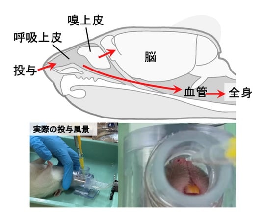図. オキシトシン経鼻投与上図は経鼻投与された薬物の移行経路を示しています。薬物は嗅上皮を通じて直接脳に到達する経路と、呼吸上皮から血管を介して全身循環に入る経路があります。下部写真は雄ラットへのオキシトシン経鼻投与実験の様子です。ラットは頭部を10°下向きに傾けた状態で麻酔マスクを装着し、薬液を鼻腔内に投与しています。この方法により血液脳関門を回避して効率的に薬物を脳に送達できます。