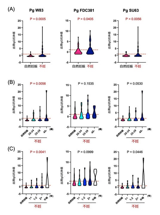 図.不妊治療患者群では歯周病原細菌であるPorphyromonas gingivalisに対するIgG抗体価が上昇している。(A)全体での解析、(B)年齢で分けた解析、(C)不妊期間で分けた解析。