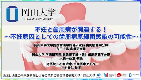 国立大学法人岡山大学(本部:岡山市北区、学長:那須保友)の大学院医歯薬学総合研究科歯周病態学分野の永田千晶客員研究員、同大学学術研究院医歯薬学域(歯)歯周病態学分野の大森一弘准教授、高柴正悟教授、三宅医院・不妊治療-生殖医療センター(岡山市南区)の三宅貴仁院長らの研究グループは、不妊治療中の患者さんは、歯周病原細菌の一つであるPorphyromonas gingivalis(Pg菌)の感染度が高いこと、そしてPg菌を感染させた歯周病マウスモデルを用いた動物実験において、雌性マウスの子宮に異常(肥大化)が生じて、出生数の減少、胎児の低体重化といった悪影響が出ることを世界で初めて確認しました。