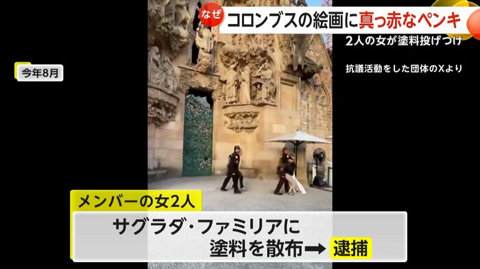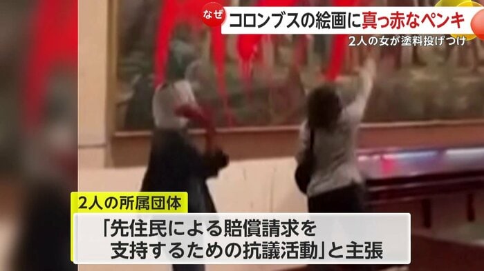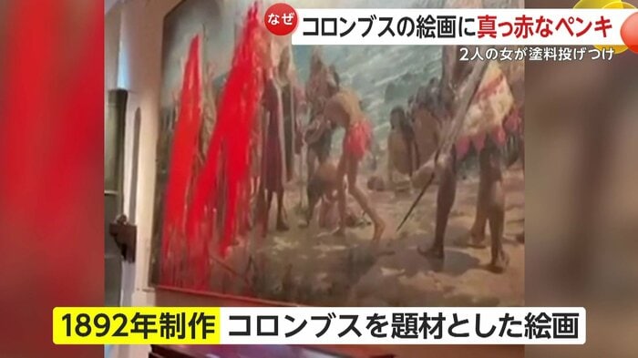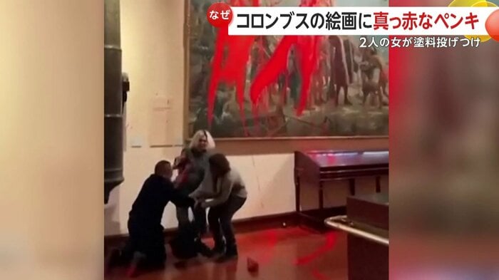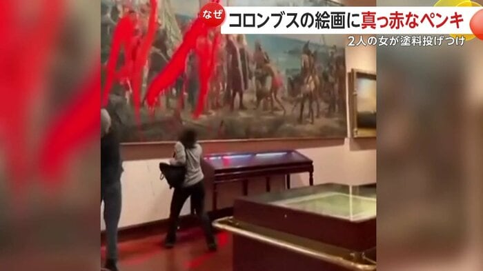 スペインの博物館で環境活動団体に所属する女性2人が、コロンブスのアメリカ大陸到達を描いた絵画に赤いペンキを投げつけ身柄を拘束された。2人は「先住民による賠償請求を支持するための抗議」と主張している。