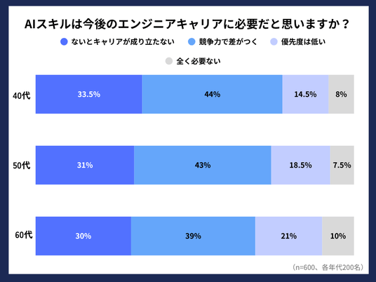 AIスキルはもはや若手だけのテーマではなく、40~60代のエンジニア全体において“キャリアを延ばすための前提条件”として定着していることが明らかになりました。