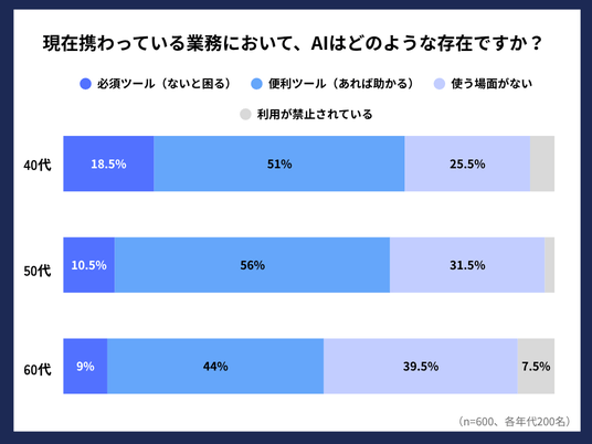 一方、「必須ツール(ないと困る)」と回答した人は40代18.5%、50代10.5%、60代9%にとどまりました。全体的に必須化はこれからであることがわかるものの、40代が最もAIを積極的に業務へ取り入れている傾向が見られました。