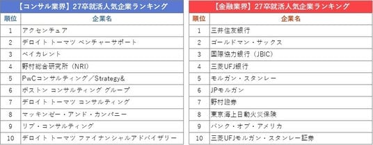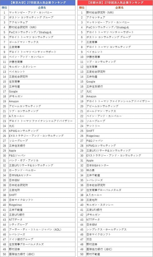 ・大学別の1位は、東京大学がマッキンゼー・アンド・カンパニー、京都大学が野村総合研