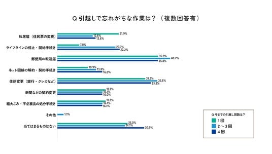 忘れがちだと思う項目として最も多く挙げられたのは「郵便局の転送届」。郵便物の受け取りに直結する重要な手続きである一方、荷造りや荷解きといった目の前の作業に追われ、後回しになりやすいことが分かります。