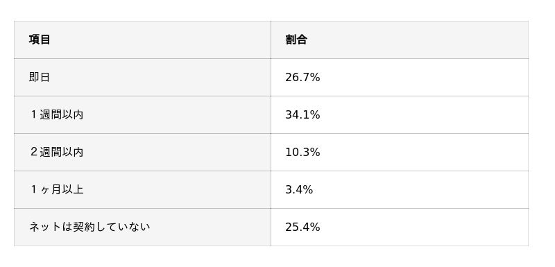 多くの人が1週間以内にネット環境を整えられる一方で、回線工事待ちの影響か約1割強は“ネットの空白期間”が2週間以上続くケースもあることが明らかになりました。