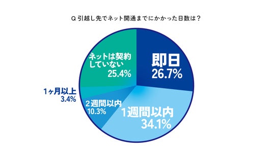 引越し先でネットを利用できるようになるまでの日数については、「即日」(26.7%)と「1週間以内」(34.1%)を合わせると、全体の約6割が1週間以内に開通している結果となりました。