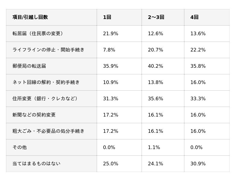 次いで多かったのは「住所変更(銀行・クレカなど)」。金融機関やクレジットカードなど複数先で手続きを行う必要があるため、作業が煩雑になりがちで、結果として抜け漏れが生じやすいことがうかがえます。