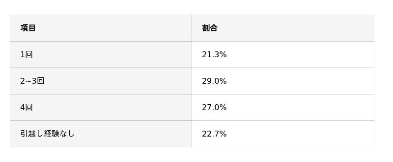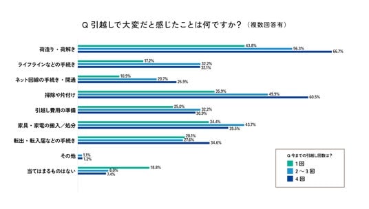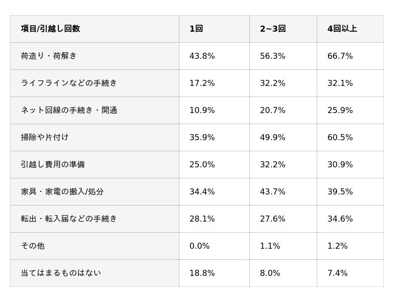 次いで「掃除や片付け」が挙がり、引越し回数が増えるにつれて大変さを感じる割合が上昇していました。(1回:35.9% → 4回以上:60.5%)荷物や生活年数が増えるほど整理や清掃の負担が大きくなる傾向があると考えられます。