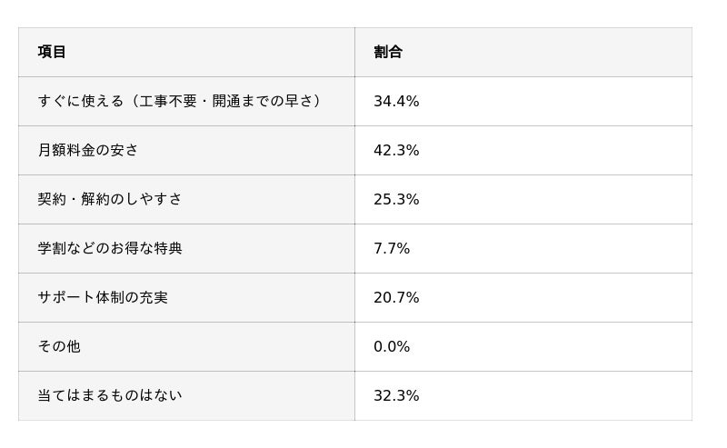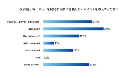 次いで「すぐに使える(工事不要・開通が早い)」(34.3%)が多く、引越し直後に発生しやすい“ネットの空白期間”を避けたいニーズが強いことがうかがえます。