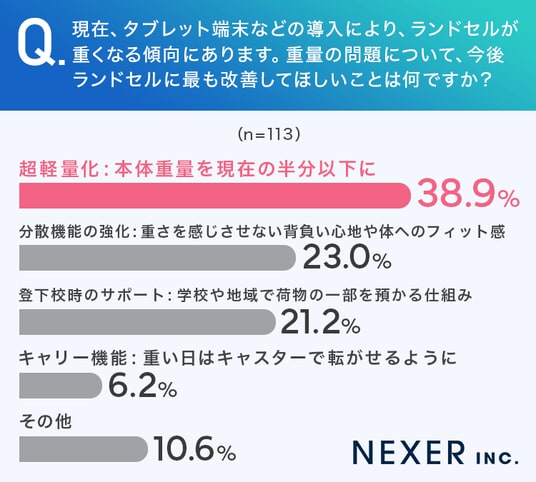 さらに「分散機能の強化」が23%、「登下校時のサポート」が21.2%と続き、物理的な軽量化と重さを感じさせない工夫の双方が重要視されていることが分かります。