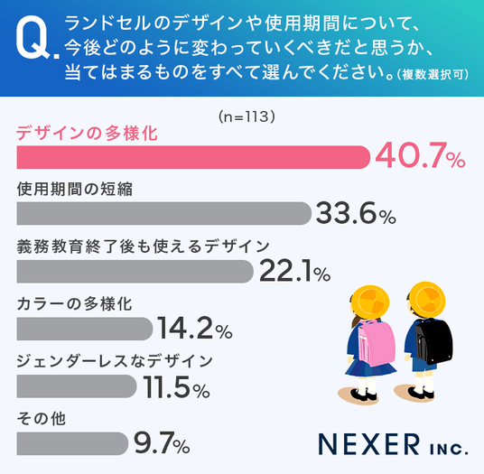 また、「使用期間の短縮」が33.6%、「義務教育終了後も使えるデザイン」が22.1%と続き、高価なランドセルを6年間使い続けるという慣習への疑問が伺えます。