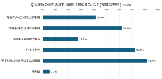 「洋服のお手入れで『面倒』と感じることは?」という質問に対し、「干すときにシワを伸ばす」(40.7%)、「アイロンがけ」(36.1%)が上位に挙がりました。日常的なお手入れの負担は“シワ対策”や“アイロンがけ”といった“見た目を整える作業”に集中しており、『清潔感のなさ』や『だらしなさ』といった印象につながる要素として、多くの人が気を配っていることが明らかになりました。