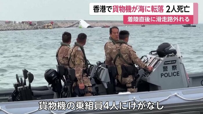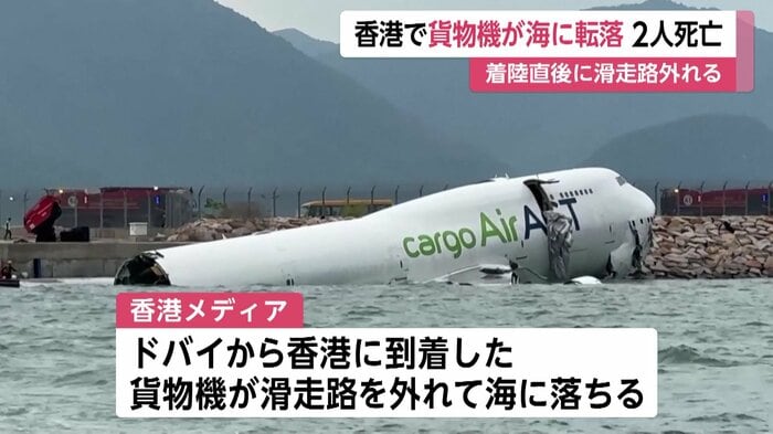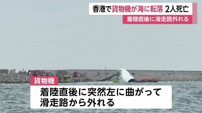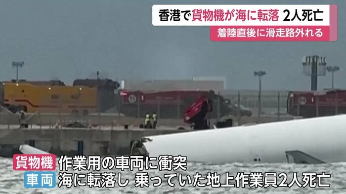香港国際空港で、貨物機が滑走路を外れて作業用の車両にぶつかり海に落ち、車両の作業員2人が死亡した。