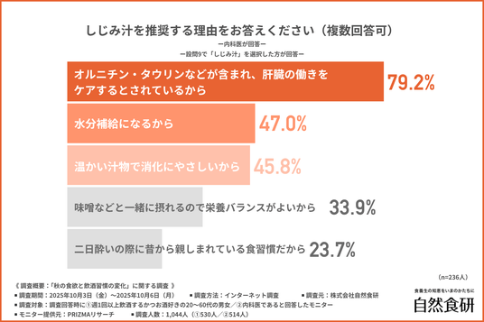 温かく消化によい食事への関心が高いことがうかがえ、中でも、しじみ汁は内科医からの信頼が厚いことが示されました。